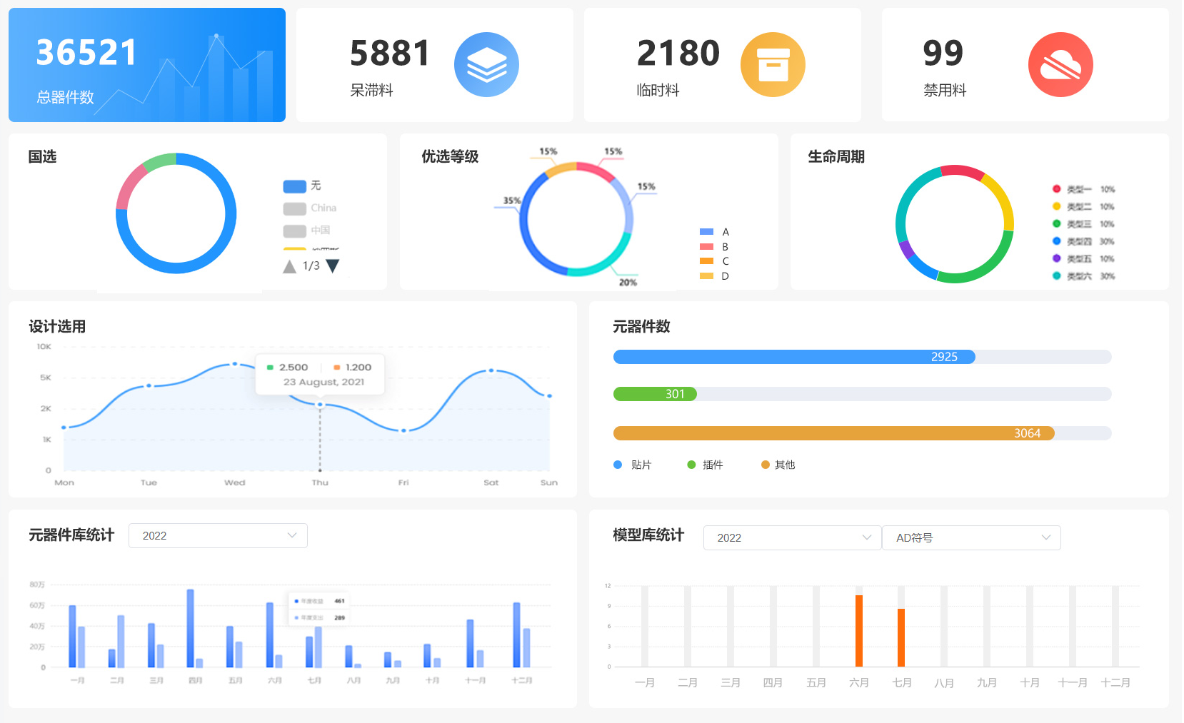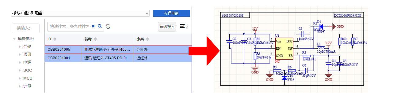 该模块可实现对模块电路进行录入、浏览、智能搜索、直接调用系统中的模块电路到 EDA 设计工具中,同时支持模块电路的选型控制,根据优选等级、禁用状态控制模块电路选用,给出禁用提示,以及使用情况统计、新增模块电路的流程管理、模块电路的修改历史记录、版本对比等。